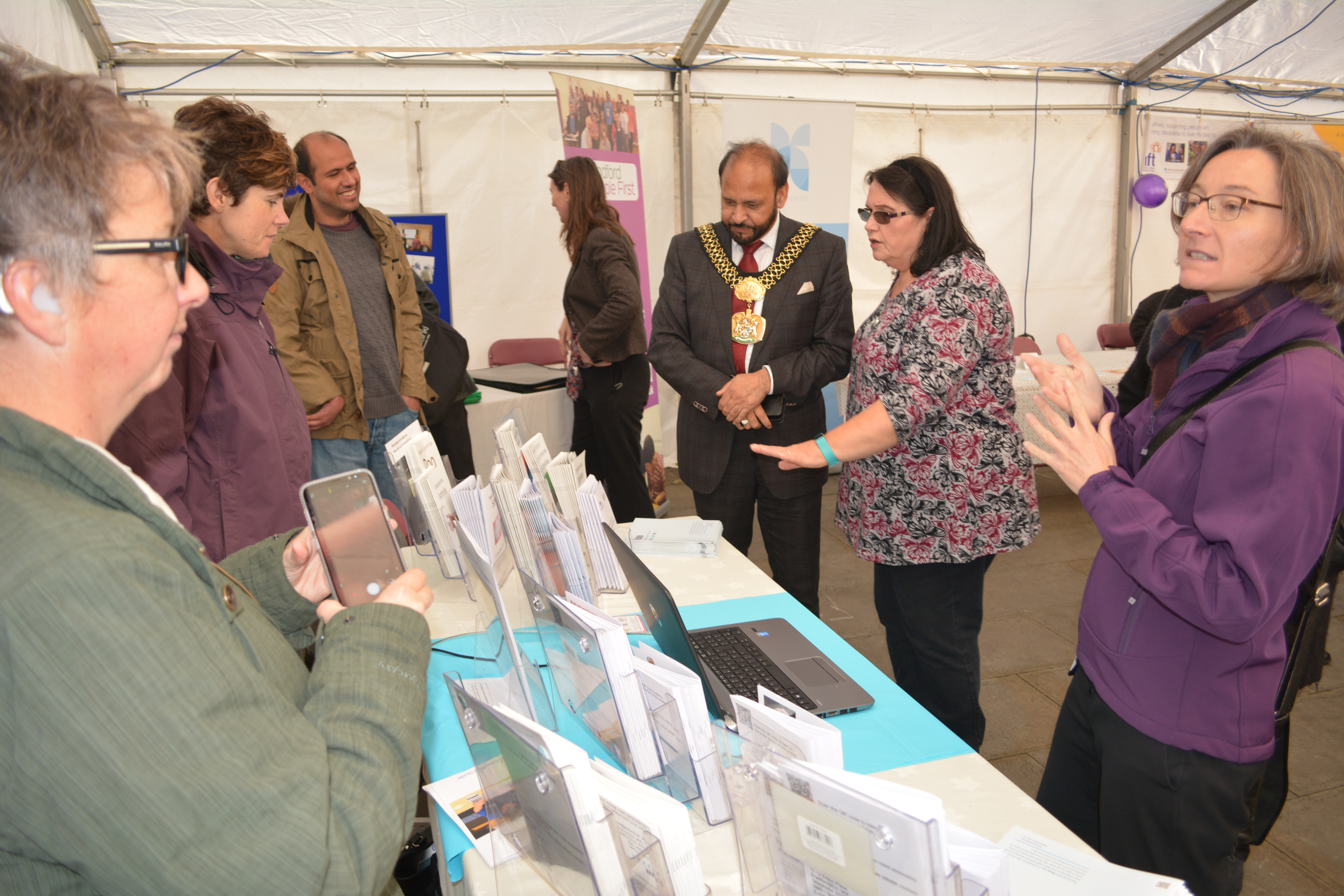 EasierAccess2017_tent EasierAccess2017_sue Sue explaining to Lord Mayor Councillor Abid Hussain what we do.